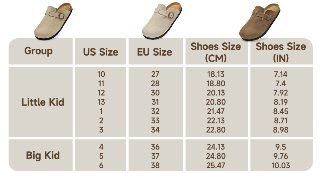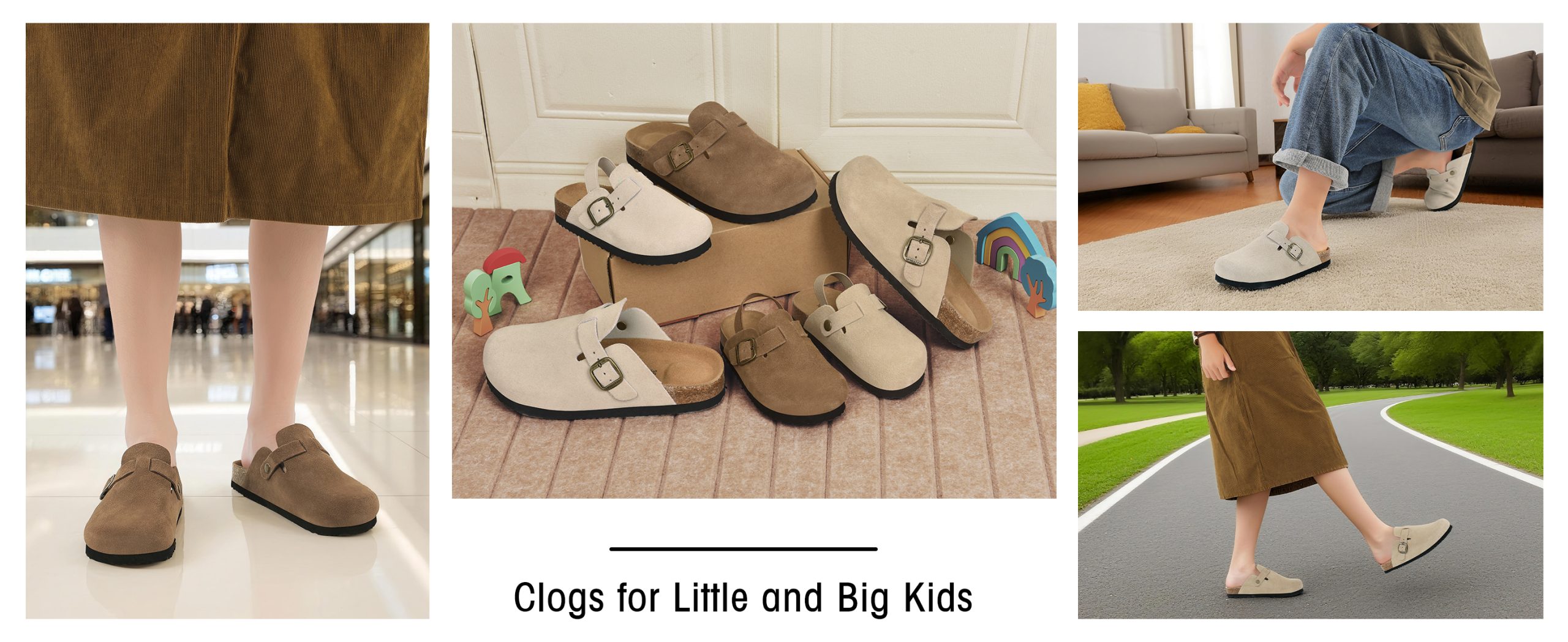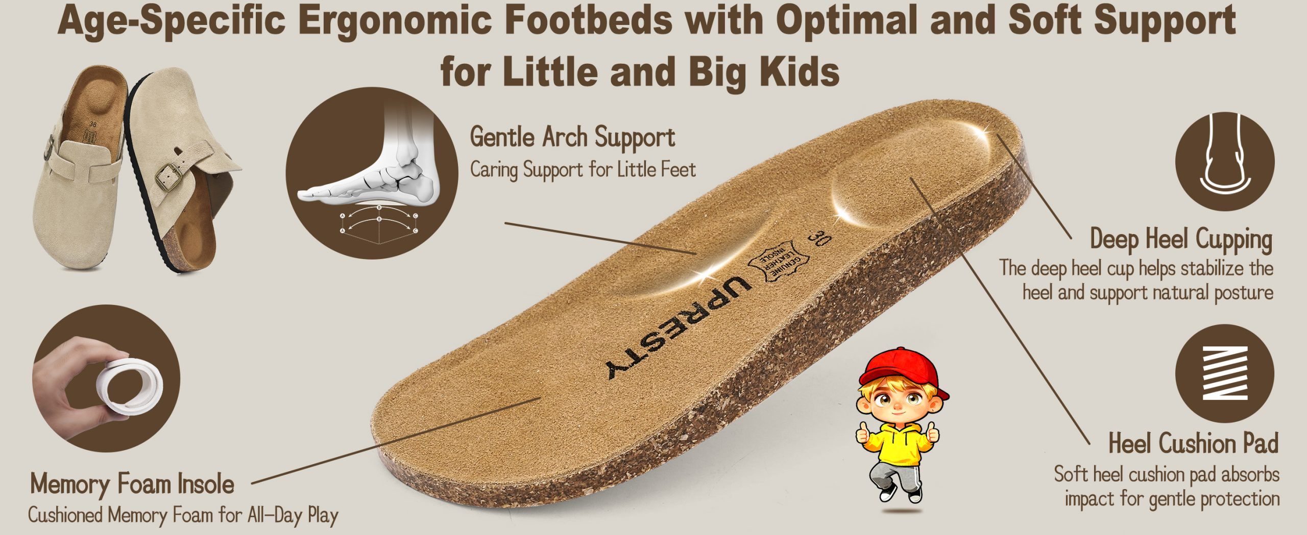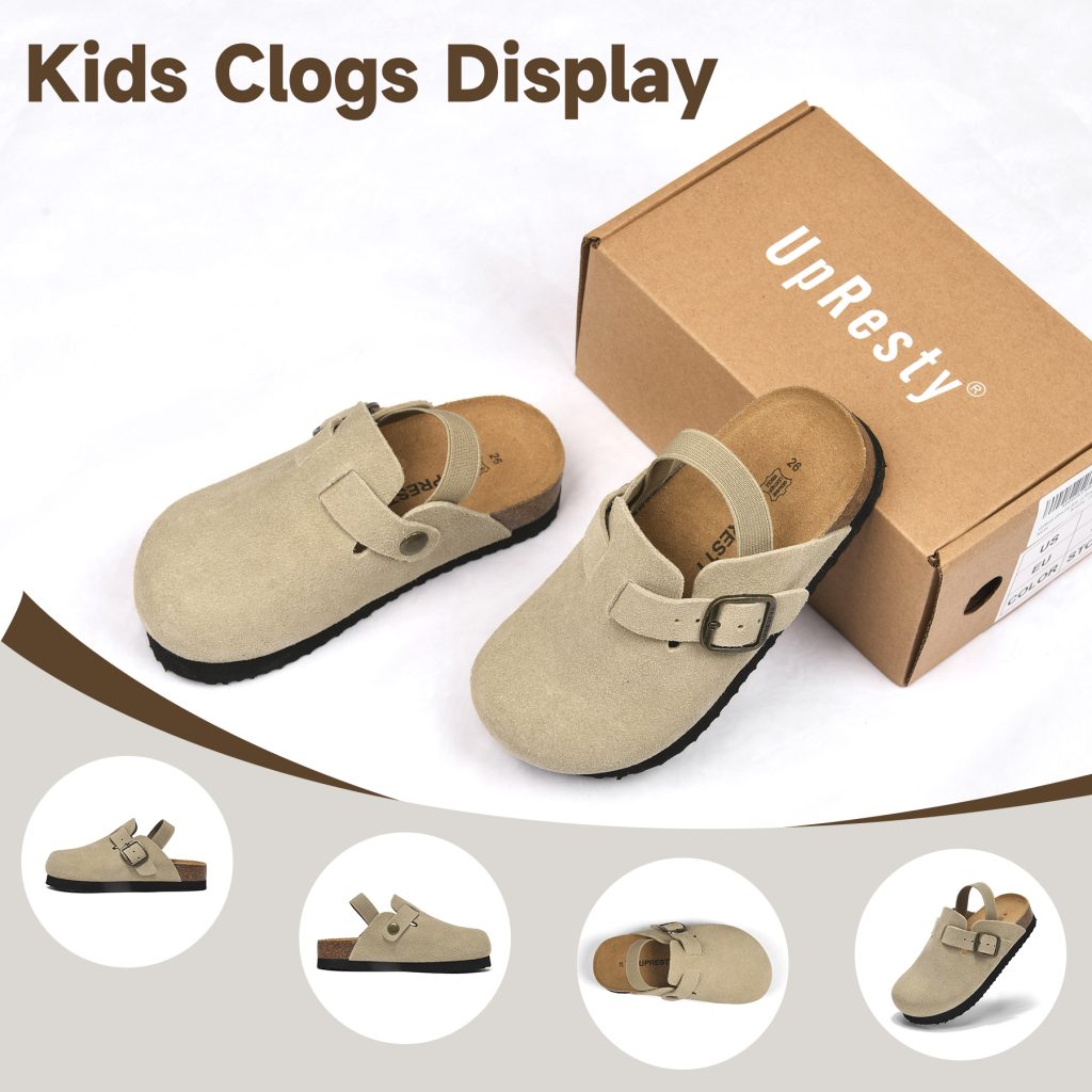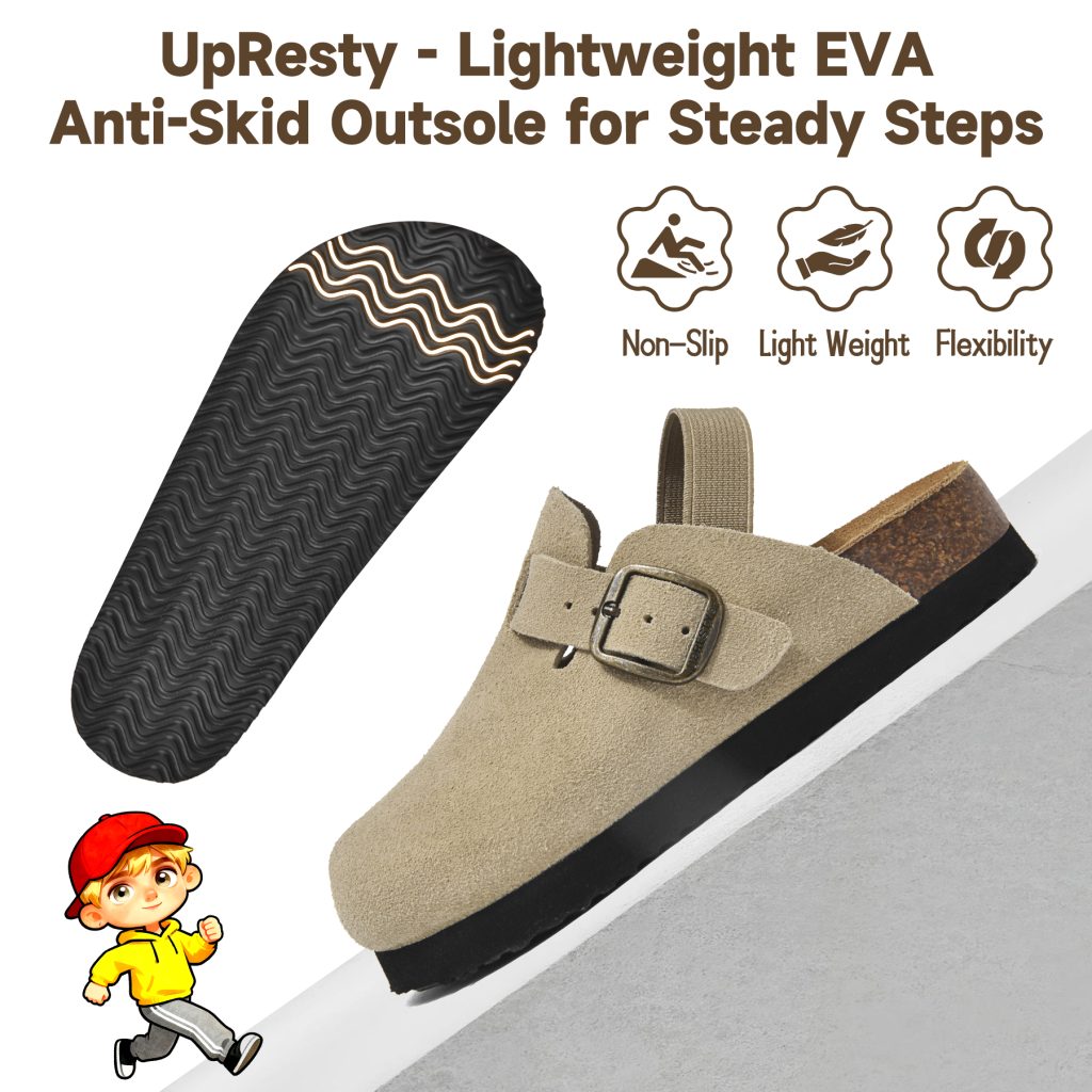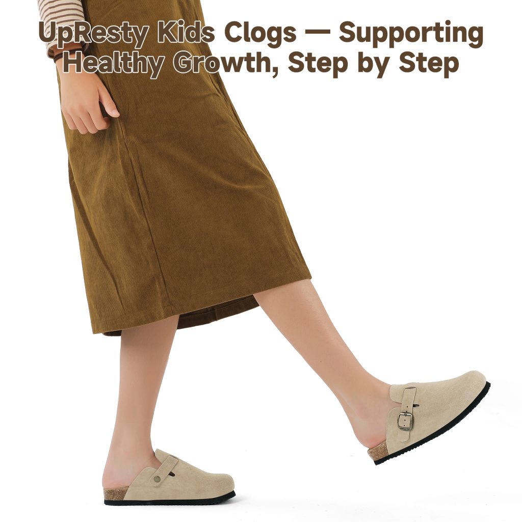 - UpResty Quality – Cork Footbed & Cute Vintage Touch: UpResty kids’ clogs contoured cork footbed supports healthy foot development, molding to your child’s foot shape for personalized comfort. The genuine suede upper with an adorable metal buckle detail adds a playful yet classic touch—easy to match with school uniforms, jeans, or dresses