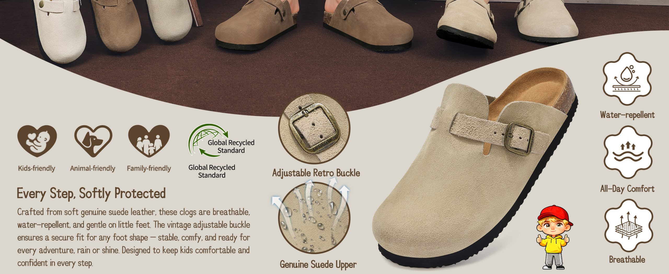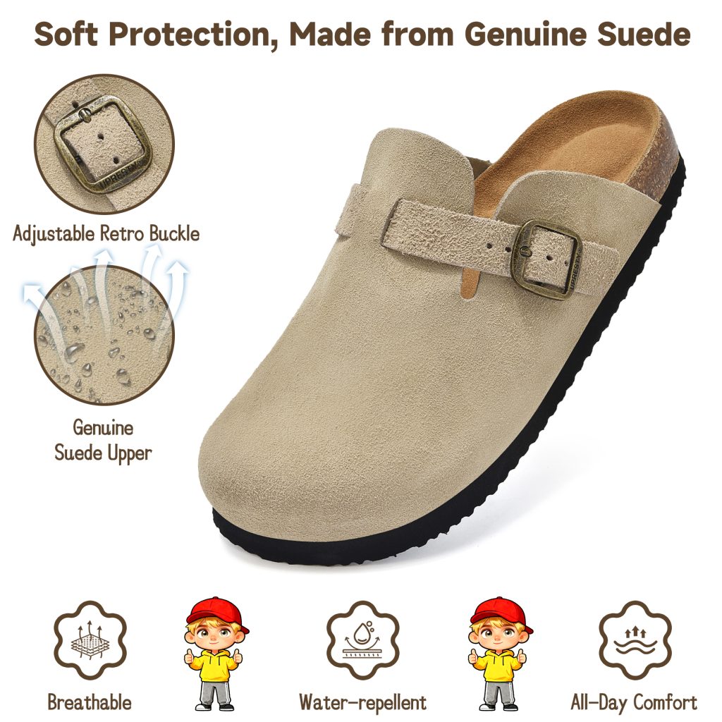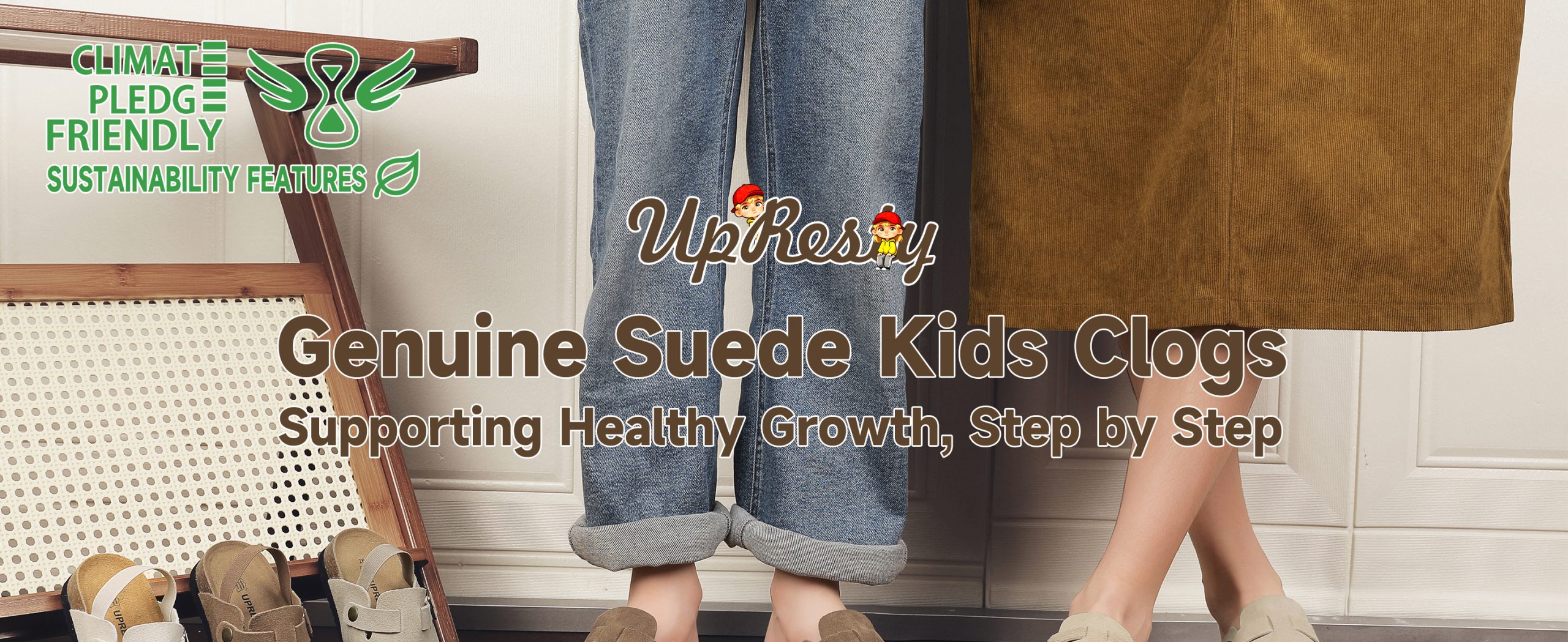- Genuine Suede – Soft & Kid-Friendly: Unlike ordinary kids’ clogs made with synthetic materials, UpResty upgrades both the upper and insole with 100% genuine suede leather. This soft, breathable material gently adapts to growing feet, giving little ones lasting comfort with every step. The suede is treated with a water-repellent finish to handle everyday splashes—perfect for playgrounds and casual outings (not for heavy rain or puddles)